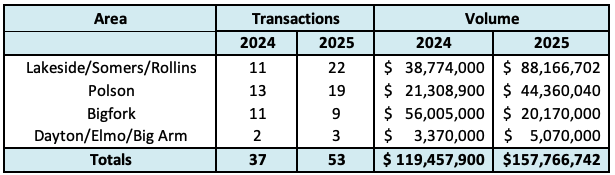 Flathead Lake Real Estate 2025 Annual Sales Report The 2025 Flathead Lake real estate market placed third for all-time annual waterfront sales volume. The market pulled back for two years after the 2021 "covid spike", and has now had two consecutive years of upswing. There were a total of 53 reported sales and over $157M in total sales volume for the year. This represents a 32% increase in total volume and a 43% increase in transactions compared to 2024. The primary drivers of the growth were a combination of continued significant sales over $5M, and an increase in inventory and sales under $2M. |