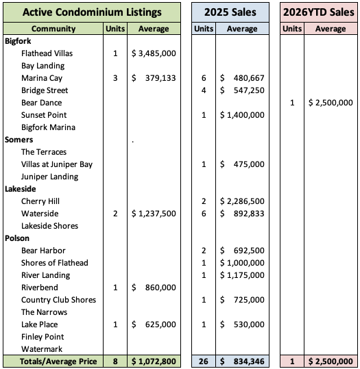 Flathead Lake Condominium Market With nearly two dozen waterfront condominium communities around Flathead Lake, there has historically been plenty of options for buyers who want the waterfront lifestyle without having to worry about maintaining a lake home. Below is a summary of currently active and sold units so far this year as compared to last year's sales. There were 26 condo sales reported in 2025. Sales started slow last year, then accelerated in early fall likely due to the lack of affordable single family inventory on the water and surpassed sales reported in 2024. One significant sale was posted in January of this year in Bigfork for $2.5M. |