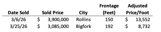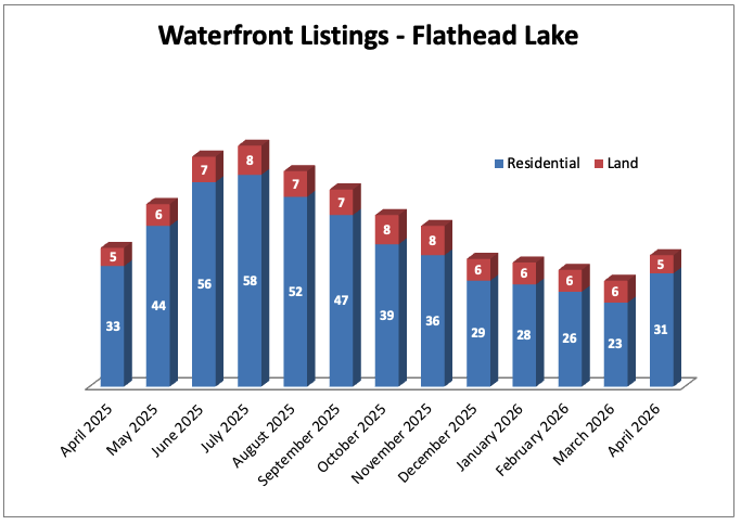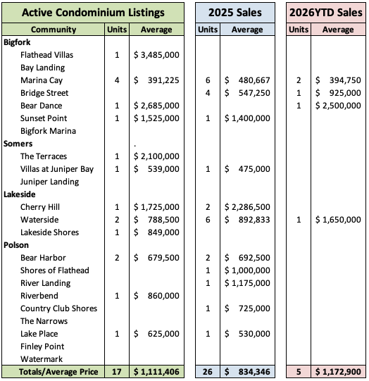 Flathead Lake Condominium Market With nearly two dozen waterfront condominium communities around Flathead Lake, there has historically been plenty of options for buyers who want the waterfront lifestyle without having to worry about maintaining a lake home. Below is a summary of currently active and sold units so far this year as compared to last year's sales. There were 26 condo sales reported in 2025. Sales started slow last year, then accelerated in early fall likely due to the lack of affordable single family inventory on the water and surpassed sales reported in 2024. |